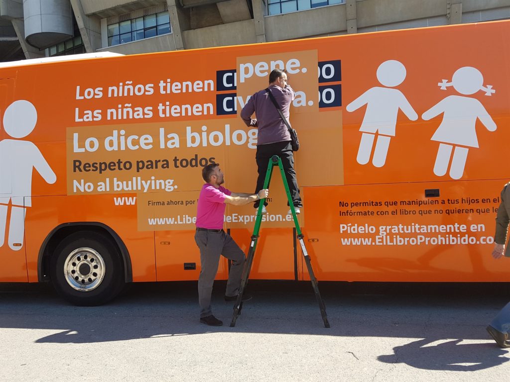 L’autobús, que es troba detingut en el peatge de Martorell amb el lema ‘Els nens tenen penis. Les nenes tenen vulva. Ho diu la Biologia. Respecte per a tots, no al bullying’, podria ser multat amb fins el 3.000 euros en aplicació de la Llei catalana 11/2014 dels drets LGTBI.