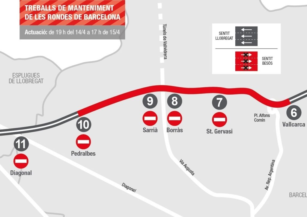 La circulació a la Ronda de Dalt, des de l’alçada de la incorporació 8 de Borràs a la 6 d’Alfons Comín en sentit Besòs, quedarà totalment tallada divendres 14 i dissabte 15 d’abril, la qual cosa coincideix amb Setmana Santa, per treballs d’aglomerat.