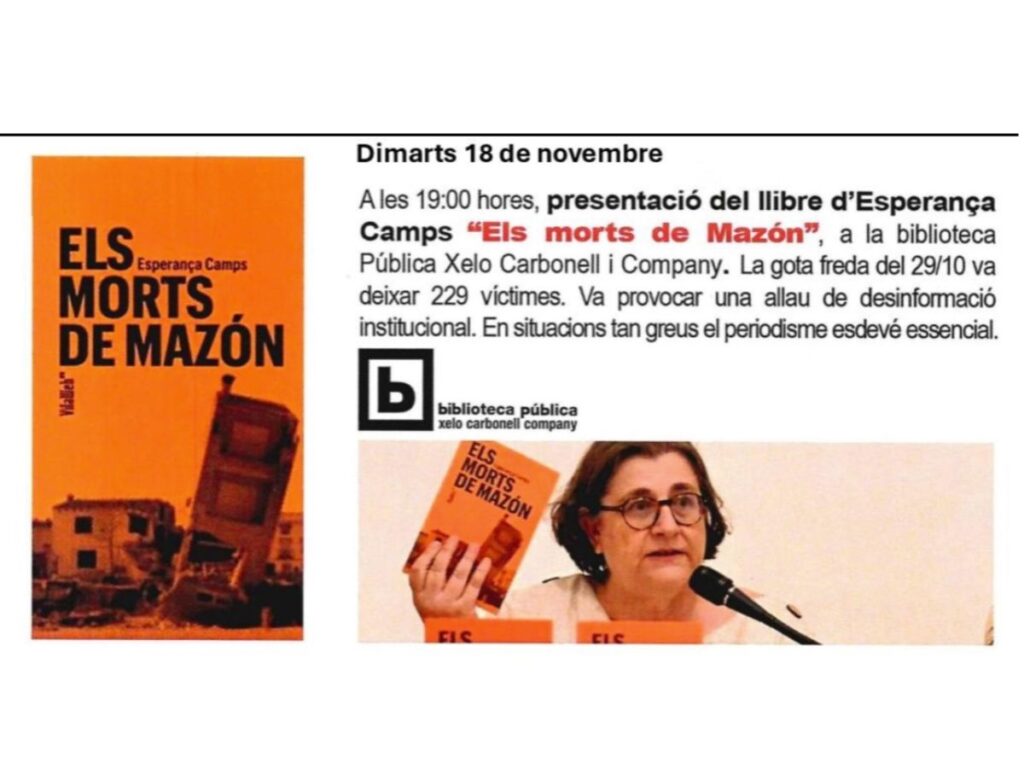L’Ajuntament de Silla (Horta Sud), amb majoria absoluta del PSOE, ha impedit la presentació del llibre Els morts de Mazón, de la periodista i cap de redacció de VilaWeb, Esperança Camps, a la biblioteca Xelo Carbonell. Aquesta presentació formava part dels actes de la 35a Setmana de les Lletres Valencianes, on també participen Vicent Flor, amb el seu llibre Contra la llengua dels valencians, i Martí Domínguez amb la novel·la Ingrata pàtria.