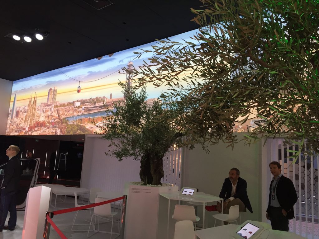 En aquest espai destaca un vídeo amb el ‘skyline’ de la capital catalana, així com dues oliveres i un expositor amb una mostra de productes identificatius de la cultura i el disseny catalans, com la torxa olímpica, la mascota Cobi i la lloseta amb la flor típica del passeig de Gràcia.