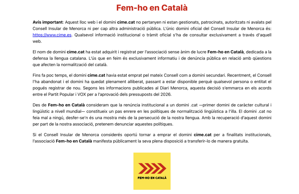 Per un altre costat, elimina l’article que deia que “tots els expedients administratius s’han de tramitar en llengua catalana”. En els texts bilingües que emeti el consell, si bé el reglament diu que el català ha de figurar en primer lloc, ara només hi diu que “sempre hi figuraran el català i el castellà”. És a dir, que el castellà podria ser la primera llengua d’ús. Com a la web institucional, que a més d’eliminar el domini .cat –Fem-ho en català l’ha comprat en una acció de protesta– elimina també la referència que el català sigui la primera opció. També en el cas dels mitjans de radiodifusió i de televisió gestionats pel Consell, en què s’estableix que la llengua vehicular “podrà ser qualsevol de les dues llengües oficials” i que, si és en català, caldrà prioritzar “l’ús formal del menorquí.”