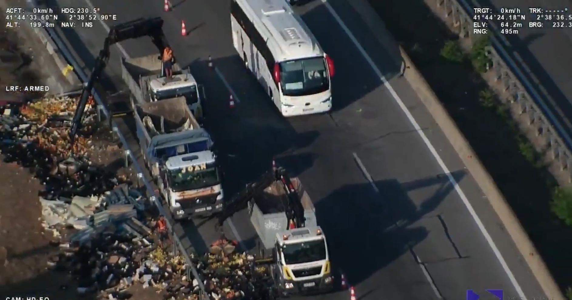 Un equip de treball continua a la zona de l'accident retirant part de la càrrega del camió i netejant l'asfalt