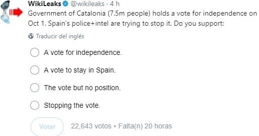 L'organització que lidera Julian Assange, Wikileaks, promou des d'aquest dijous durant 24 hores una enquesta en Twitter en la qual informa de l'organització del referèndum de l'1 d'octubre i en la qual assegura que la policia i els serveis d'intel·ligència estatals "tracten de frenar-ho".