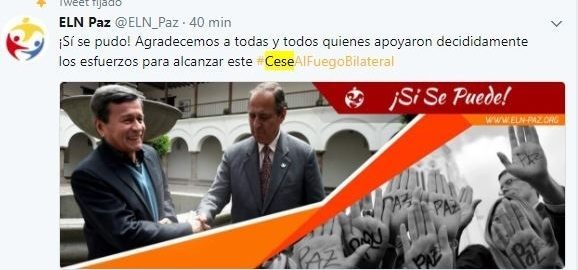 El Govern colombià i la guerrilla de l'Exèrcit d'Alliberament Nacional (ELN) han aconseguit un acord per a un alto el foc bilateral de quatre mesos per facilitar el procés de pau actiu entre ambdues parts, segons han informat mitjans colombians.
