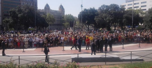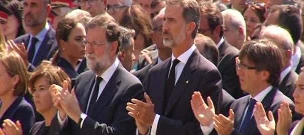 El rei, els presidents del Govern espanyol i el de Generalitat i més autoritats han estat conversat uns minuts aquest dissabte al migdia a la plaça de Catalunya de Barcelona, després d'encapçalar junts el minut de silenci per l'atemptat d'aquest dijous.