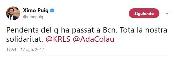 El president de la Generalitat valenciana, Ximo Puig, i dirigents polítics valencians han llançat en els seus comptes de Twitter missatges en els quals es mostren preocupats per l'atropellament massiu en La Rambla de Barcelona, que a les 18.05 hores s'ha confirmat com un atemptat terrorista, i en els quals expressen la seva solidaritat amb els afectats.