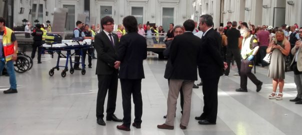 El president de la Generalitat, Carles Puigdemont; l'alcaldessa de Barcelona, Ada Colau, i el delegat del Govern espanyol a Catalunya, Enric Millo, han acudit a l'estació de França de Barcelona després de l'accident d'un tren de Rodalies que ha deixat una cinquantena de persones ferides.