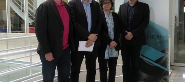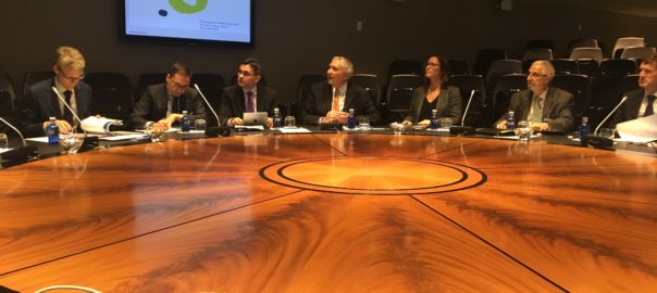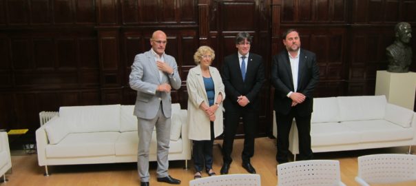 El president de la Generalitat, Carles Puigdemont; el vicepresident, Oriol Junqueras, i el conseller d'Afers Exteriors, Raül Romeva, s'han reunit aquest dilluns amb l'alcaldessa de Madrid, Manuela Carmena.