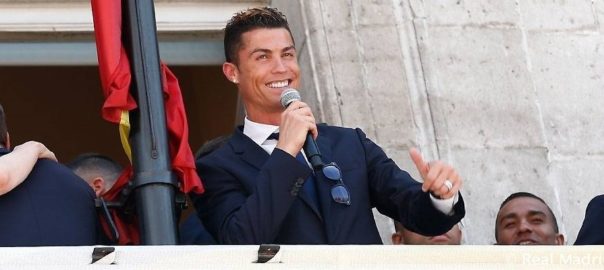 El davanter portuguès del Reial Madrid, Cristiano Ronaldo, ha oferit la trentena tercera Lliga a l'afició del conjunt blanc des de la balconada de la Comunitat de Madrid i ha afirmat que ara l'objectiu és tornar el pròxim 4 de juny amb la Lliga de Campions, la final de la qual es disputa la vetlla a Cardiff contra la Juventus.