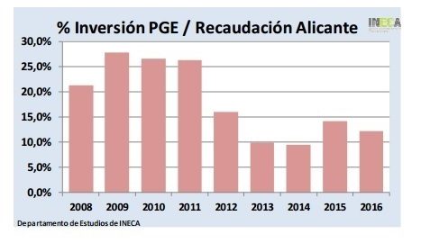 La recaptació tributària de l'Estat en la província d'Alacant s'ha mantingut estable en els últims zinc exercicis entorn dels 2.500 milions d'euros, mentre que la inversió directa de l'Estat a través dels Pressupostos Generals (PGE) s'ha anat reduint gradualment des dels 400 milions previstos en 2012 als 178 pressupostats per a este 2017.