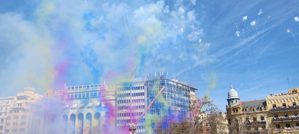 Una 'mascletà', la novena d'enguany, amb la Senyera de fons i un final intens ha enlluernat als valencians que han acudit este dijous fins a la Plaça de l'Ajuntament de València. Els artífexs d'esta obra d'art han sigut els membres de la Pirotècnia Gironina, de Pedralba.
