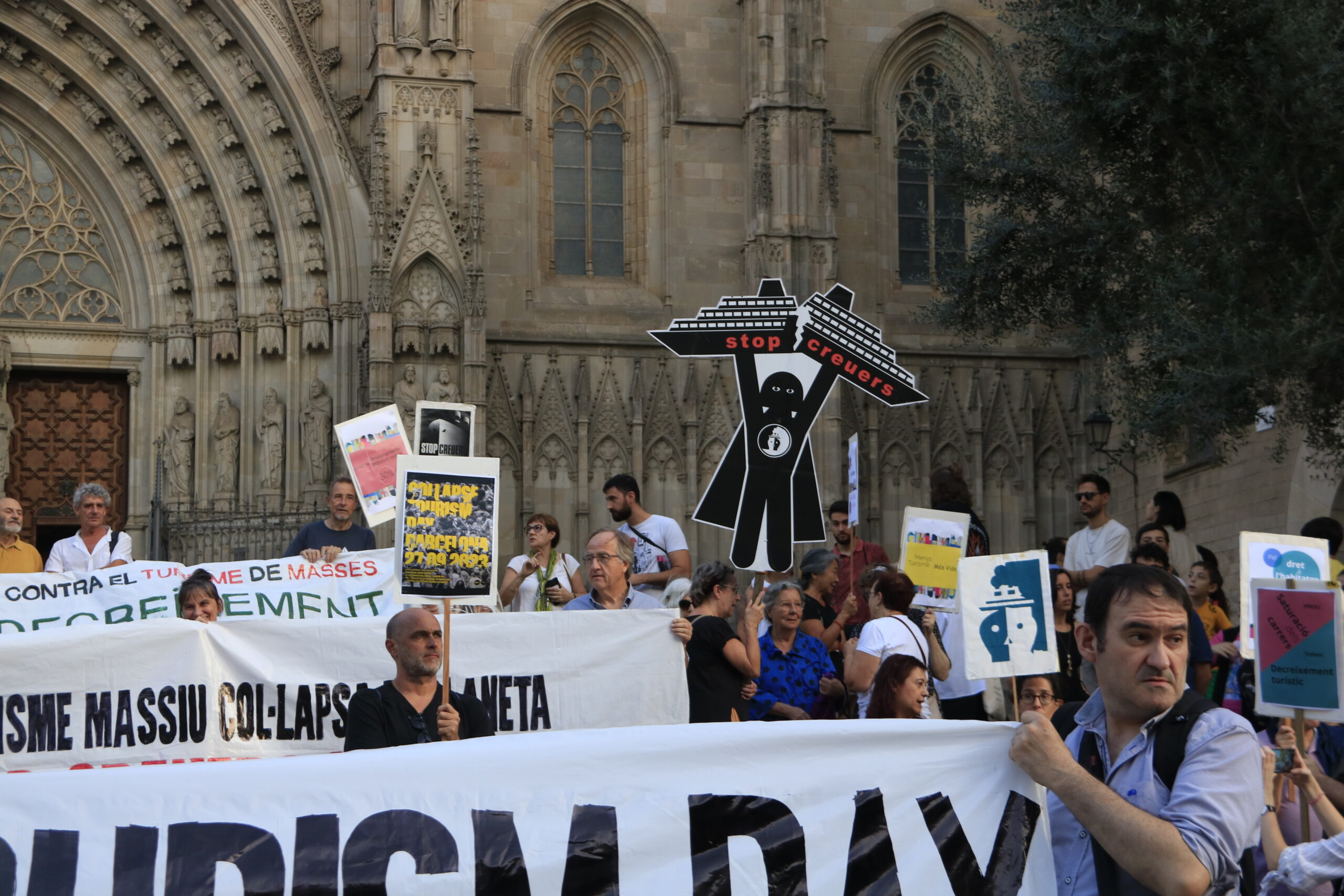 Els manifestants bloquen el carrer del Bisbe per mostrar els problemes causats per la sobreocupació de l'espai públic al Gòtic
