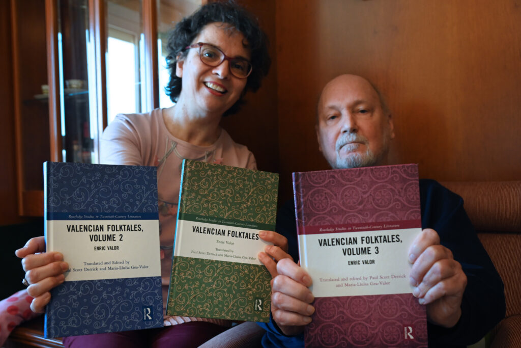 Els lectors anglo-saxons ja poden llegir les Valencian Folktales, és a dir, “Esclafamuntanyes”, “Història del mig pollastre” o “El llenyater de Fortaleny” en anglès. Es tracta de la traducció de les Rondalles valencianes d’Enric Valor, publicada, en tres volums, per la prestigiosa editorial Routledge. Els autors de la traducció són els professors de la Universitat de València Maria Lluïsa Gea Valor i Paul Scott Derrick. Són parella i a més, ella és néta d’Enric Valor. Una néta que de xicoteta va estar molt unida a l’avi, amb qui passejava per la muntanya i que es delia per escoltar com ell li explicava les rondalles. Scott Derrick és de Carolina del Sud, però fa anys que viu a València. A més de professor de literatura, és traductor i escriptor.