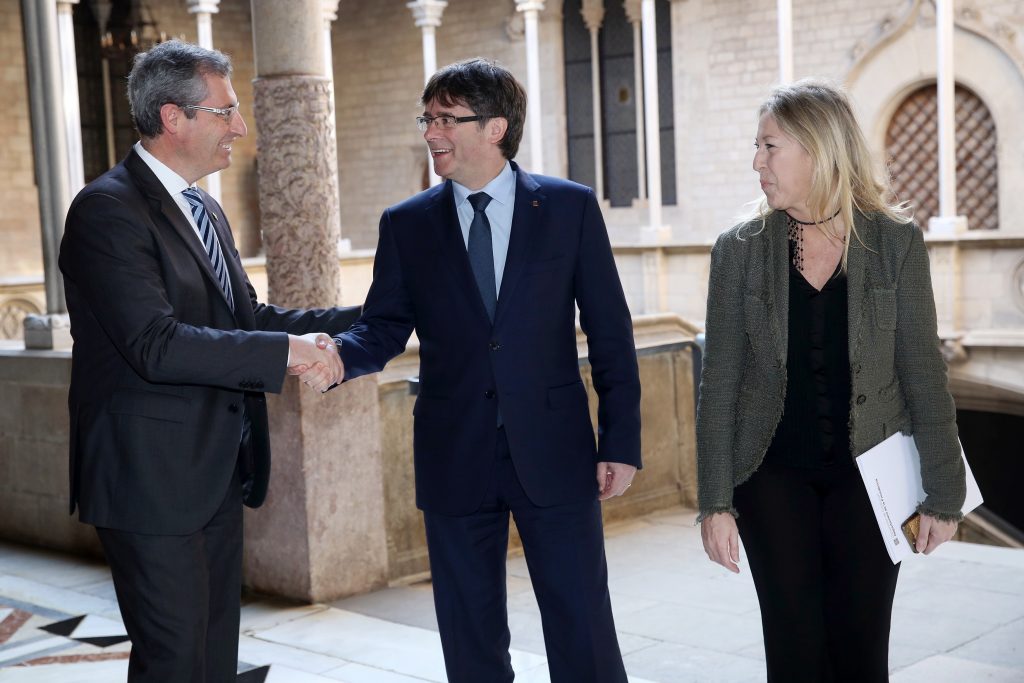 El president de la Generalitat, Carles Puigdemont, s’ha reunit aquest dimecres amb el diputat general de Guipúscoa, Markel Olano, al Palau de la Generalitat.