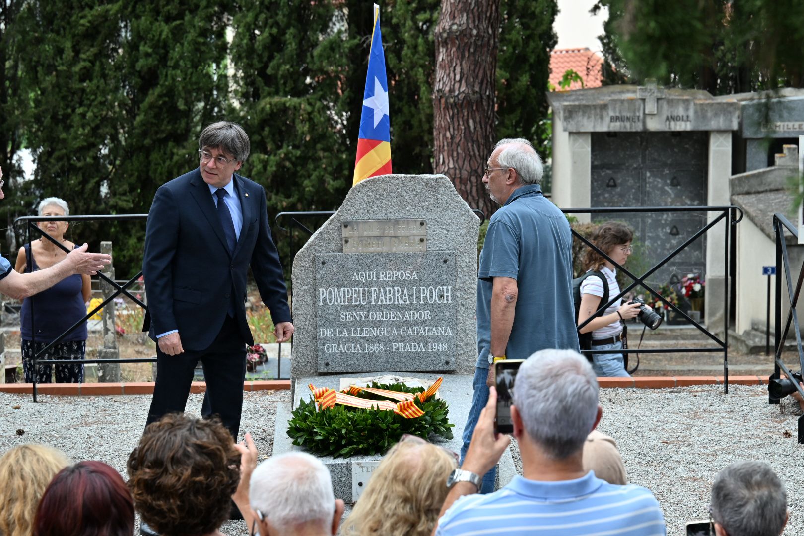Per Puigdemont, la biografia de Fabra explica la coherència d’algú que va saber que el seu sacrifici personal era la salvaguarda i l’enfortiment de la llengua catalana, i que va saber que no podria tornar a casa seva i moriria a l’exili, a Prada, on encara és enterrat. “En la victòria i la desfeta, Pompeu Fabra no va fallar mai. Sempre, fins al seu darrer alè, va entendre que l’obra de salvar una llengua és tan colossal que no sobra mai ningú i que no es pot abandonar encara que en el teu entorn les bombes cada dia caiguin més a prop”, ha dit.
