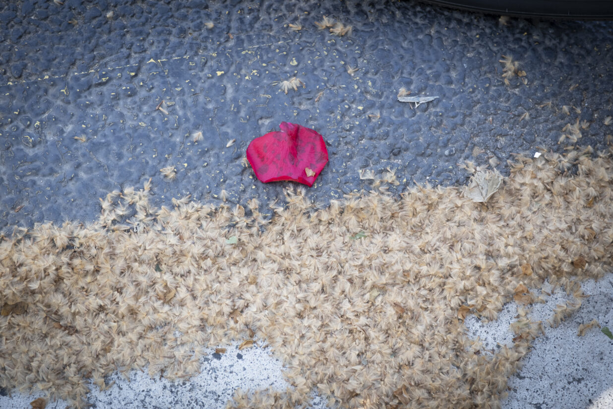 Aquest fruit, format d’ençà de la primavera passada, arriba ara al punt de maduresa i es desfà. Passa de ser una bola d’uns cinc centímetres de diàmetre, amb petites punxes, a descompondre’s en llavors i en uns pèls molt fins que arrossega el vent. Aquestes partícules cauen i fan la sensació com si plogués.