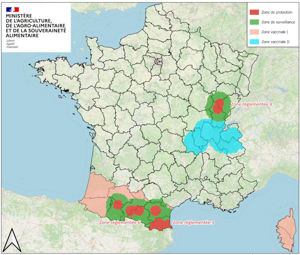 Les zones ZR3 (Catalunya Nord, Aude i Arieja) i ZR6 (Arieja) continuen essent prioritàries per a la vaccinació, i una zona vaccinal addicional cobreix els espais entre focus llunyans. A més, Còrsega aplica una vaccinació preventiva de tot el bestiar per protegir-se de la propagació de Sardenya estant.