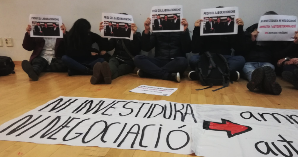 Una desena de manifestants d’Arran i els CDR han entrat a la seu d’ERC, al carrer Calàbria de Barcelona. Han fet una sentada amb una pancarta que reclama que no hi hagi investidura ni negociació amb l’estat espanyol i amnistia i autodeterminació per Catalunya.