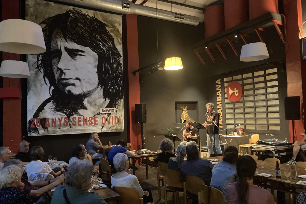 Fa molts anys que l’Ovidi Montllor dina i sopa cada dia al Tarambana. Un gran retrat seu pintat sobre tela, de 4 metres per 6, presideix el menjador. N’és l’autor Josep Castells, constructor de decorats i escenògraf en un taller diferent d’on havia fet feina l’Andreu, que es va oferir a fer-lo en ocasió del vintè aniversari de la mort del cantant alcoià. Com que no en va especificar les mides, la sorpresa de l’Andreu quan el va veure acabat va ser semblant a les dimensions del quadre. És així com l’Ovidi acompanya de ben a la vora la munió de concerts, conferències, vermuts literaris i activitats múltiples i variades que s’organitzen sobre la petita tarima que hi fa d’escenari. Abans de la pandèmia, que apareix més d’una vegada a la conversa, podien arribar a organitzar tres concerts un mateix cap de setmana. Ara costa més. Un esment a banda mereix el cicle Off Tastautors, uns concerts que serveixen per a fer xup-xup abans no comenci el cicle de música d’autor que la bona gent de l’Esquellot va començar a organitzar a Cardedeu fa vint-i-dos anys i que justament es clourà, enguany, amb l’actuació de Mazoni (dissabte).