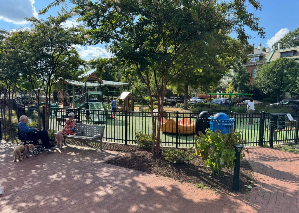 Jane Lang, de setanta-vuit anys, seu en un d’aquests bancs amb la seva parella i el seu gos, en Pippin, mentre mira distretament els infants jugar. Fundadora de l’Atlas Performing Arts Center, al nord-est de la ciutat, Lang es traslladà a aquest barri l’any 2014. “Tothom que ve ací és benvingut, hi tingui casa o no”, diu Lang, que fa cinquanta-cinc anys que viu a l’àrea metropolitana de Washington.