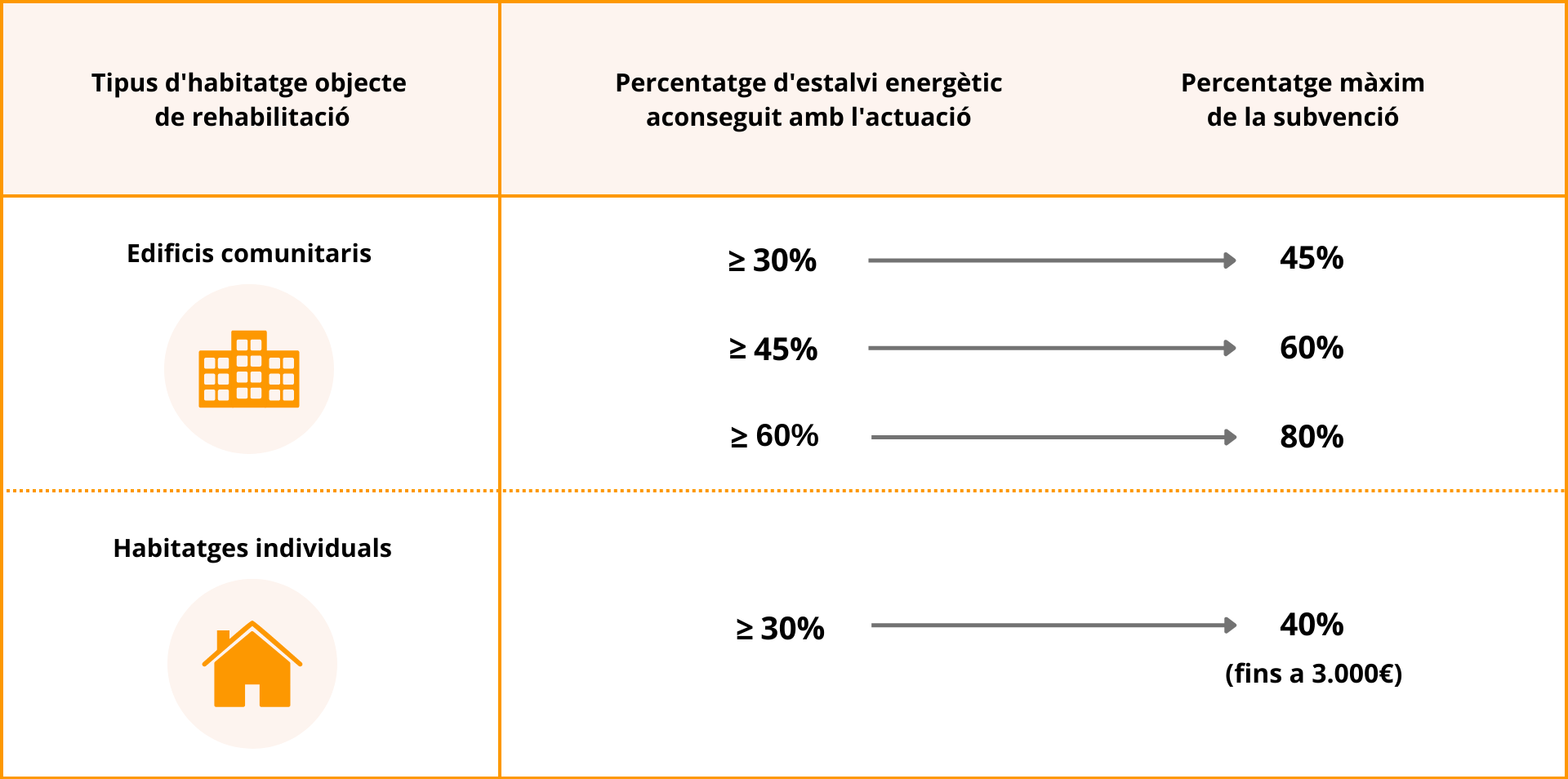 Aquestes línies d’ajut es basen en criteris d’eficiència energètica per incrementar l’estalvi i potenciar la lluita contra l’emergència climàtica, ja que, segons afirma José Antonio Artímez, director general del CMH, “els edificis són responsables, actualment, de prop d’un 40% de les emissions contaminants”. Per això, la quantia de les subvencions depèn del percentatge d’estalvi energètic que s’aconsegueixi amb la rehabilitació i pot arribar a cobrir fins al 80% del cost de la inversió, amb un màxim de 21.400 euros per habitatge.