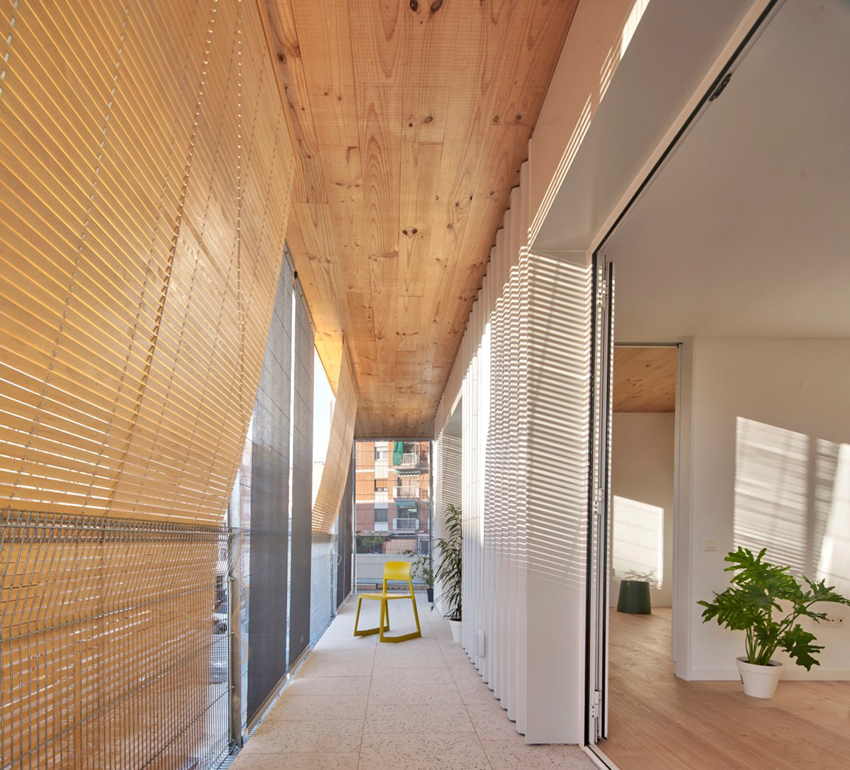 Així, a banda de dotar-se d’una gran qualitat arquitectònica, les promocions de l’IMPSOL són construccions innovadores i sostenibles, que aposten per reduir la petjada ecològica i minimitzar les emissions de CO2, ja que ‘amb la situació d’emergència climàtica que tenim’, afirma Borrell, ‘no ens podem permetre el luxe de no fer edificis que siguin pioners, puntes d’iceberg de tot el que ens ha de seguir’. Per assolir la màxima eficiència energètica, els habitatges aposten per l’ús d’energies renovables, amb la instal·lació de sistemes d’aerotèrmia, que aprofiten l’energia de l’aire per produir calefacció i aigua calenta, i es complementen amb plaques fotovoltaiques per als serveis comunitaris. Els edificis també es caracteritzen per l’ús de materials reciclats i reciclables, com l’estructura de fusta de l’edifici PISA de Cornellà, i per la reducció de la demanda energètica, gràcies a l’augment d’aïllaments, que alhora permeten la ventilació creuada.