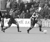 + Toni Mora intenta penetrar a l'interior de l'àrea contrària, perseguit per Txomin.  Foto: TONI MULA