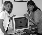Marta Julià i Gemma Suñé fotografiades ahir al costat de l'ordinador amb la seva pàgina oberta.