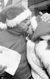 + Una parella afortunada de Vic es besa al mig del carrer de la sort. Foto: ORIOL DURAN.