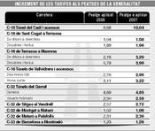 L'augment mitjà de les tarifes dels peatges de la Generalitat que ahir va aprovar Política Territorial serà d'un 3,28% entre l'IPC i el que estableixen els contractes amb les concessionàries. La Generalitat calcula en 1.200 milions el rescat integral de les concessions dels quatre peatges que a partir del febrer es volen bonificar anualment fins al final dels contractes.