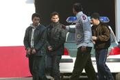 + Els tres detinguts, emmanillats, segueixen les instruccions d'un guàrdia de paisà, i un agent uniformat posa bé els farcells d'haixix. Foto: LLUÍS SERRAT
