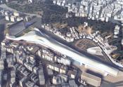 Isozaki presenta l'esbós del complex, que inclou un centre cultural, un auditori, una pista de gel, un alberg juvenil, un gimnàs, una piscina, un vestíbul multifuncional, un bow·ling, un hotel amb restaurant, un banc, una oficina de correus i dos aparcaments subterranis.