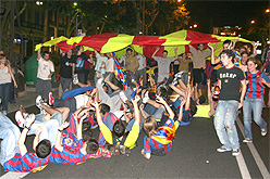 Barcelonistes celebrant la victòria al carrer Tallers.