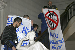Cinc activistes de Jóvens de les Terres de l'Ebre s'han encadenat aquest migdia durant una hora a la seu del Departament d'Economia de la Generalitat per denunciar la construcció de dos nous parcs eòlics a la Fatarella i a Corbera d'Ebre (Terra Alta), que consideren il·legals, i protestar contra la construcció en massa de generadors eòlics a la comarca. També asseguren que el parc de Corbera d'Ebre es construeix damunt d'una fossa comuna de la guerra.