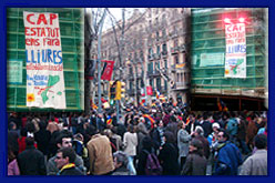 A un xamfrà de la Gran via, al pas de la manifestació, joves independentistes ha deixat anar pel davant d'una bastida d'obra una pancarta en que s'hi llegia "Cap Estatut ens farà lliures · Autodeterminació · Prou retallades al territori".